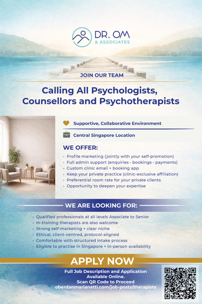 We are looking for Psychotherapists and Counsellors (from Trainees to Senior Supervisors) who want to practice with depth, autonomy, and the backing of a premium brand in the heart of Chinatown.